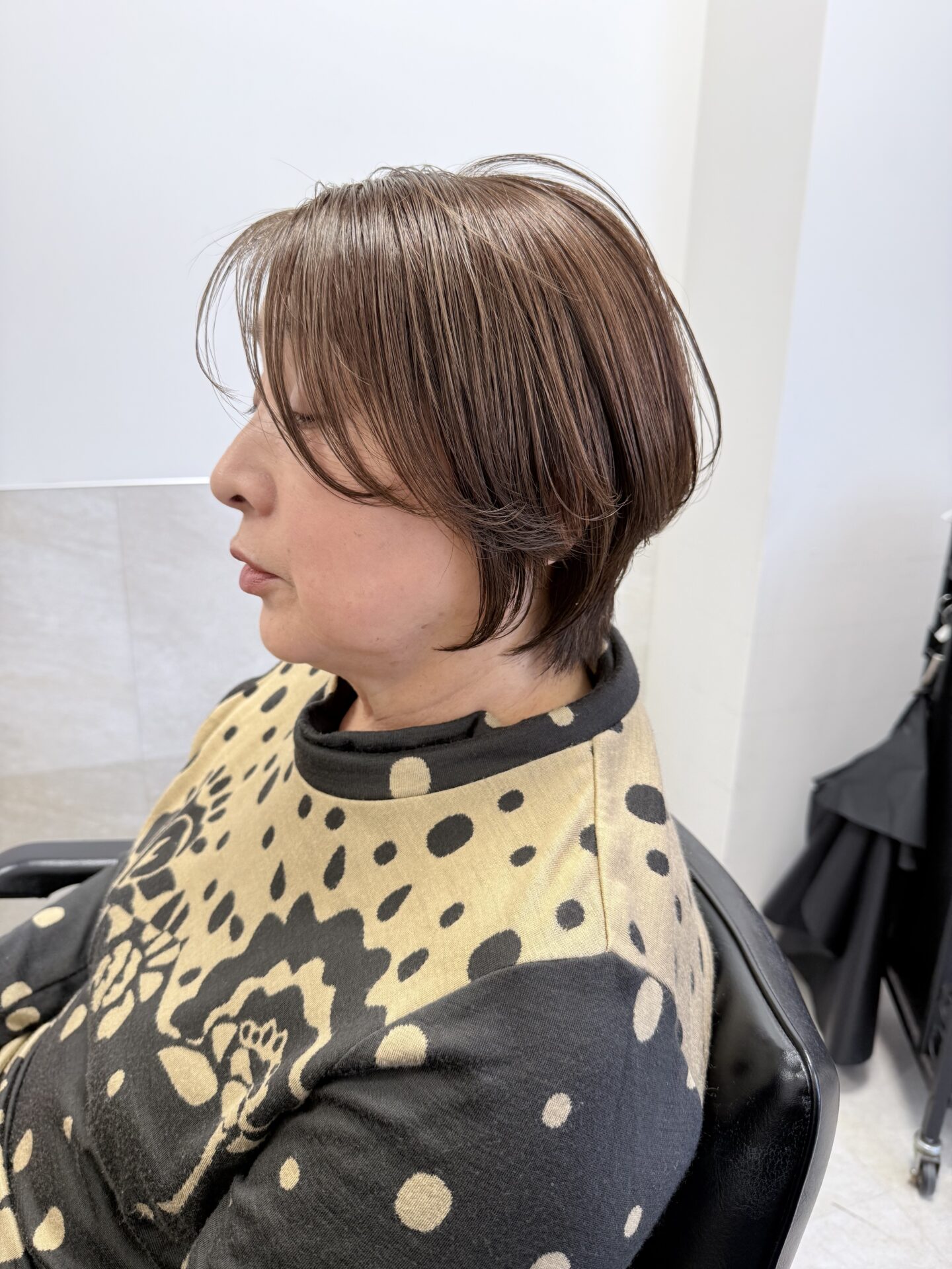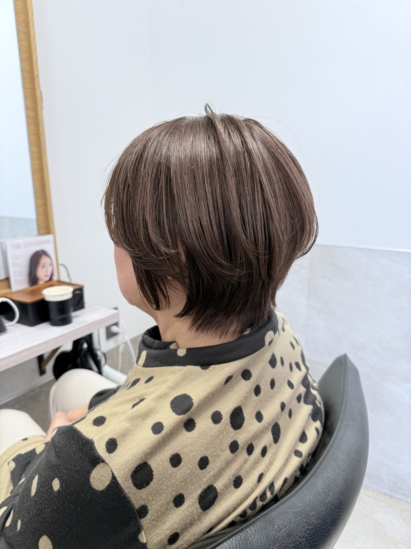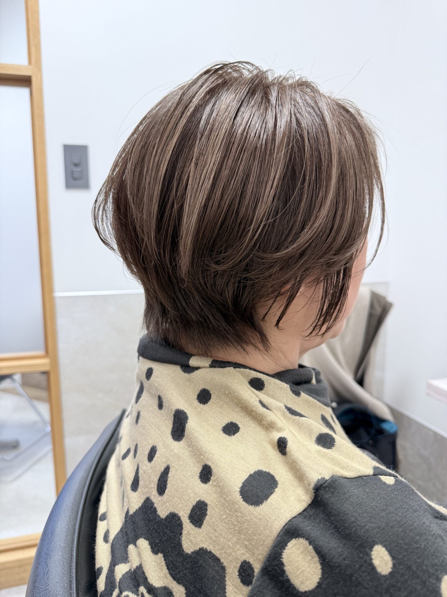 ハイライトの名残を活かしたカラーリング。ベージュ系の色味で上品な大人ショート