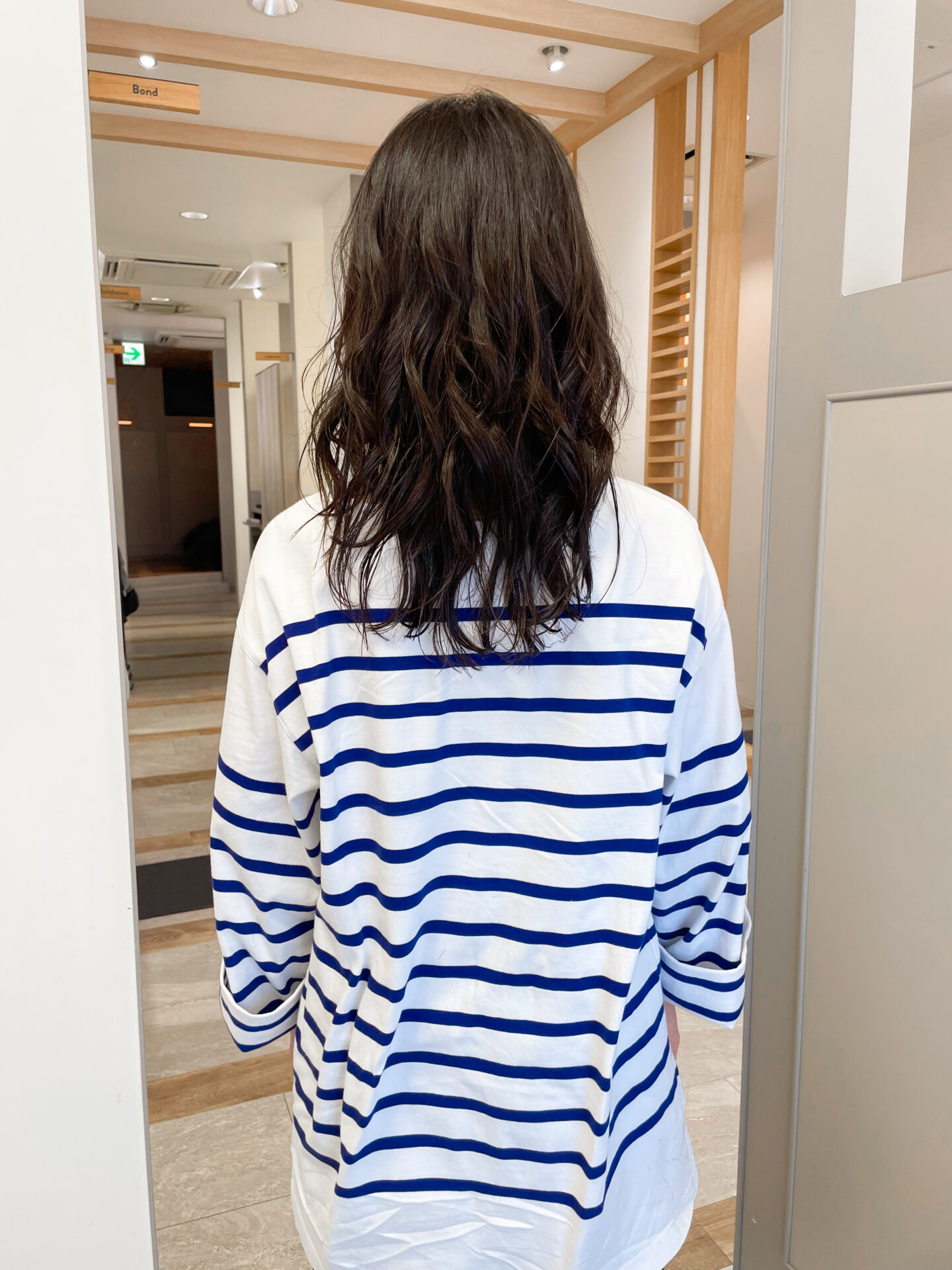 顔周りにレイヤーをいれました。いつもストレートでお仕上げが多かったので今回は26ミリのコテを使いパーマ風にアレンジしました。