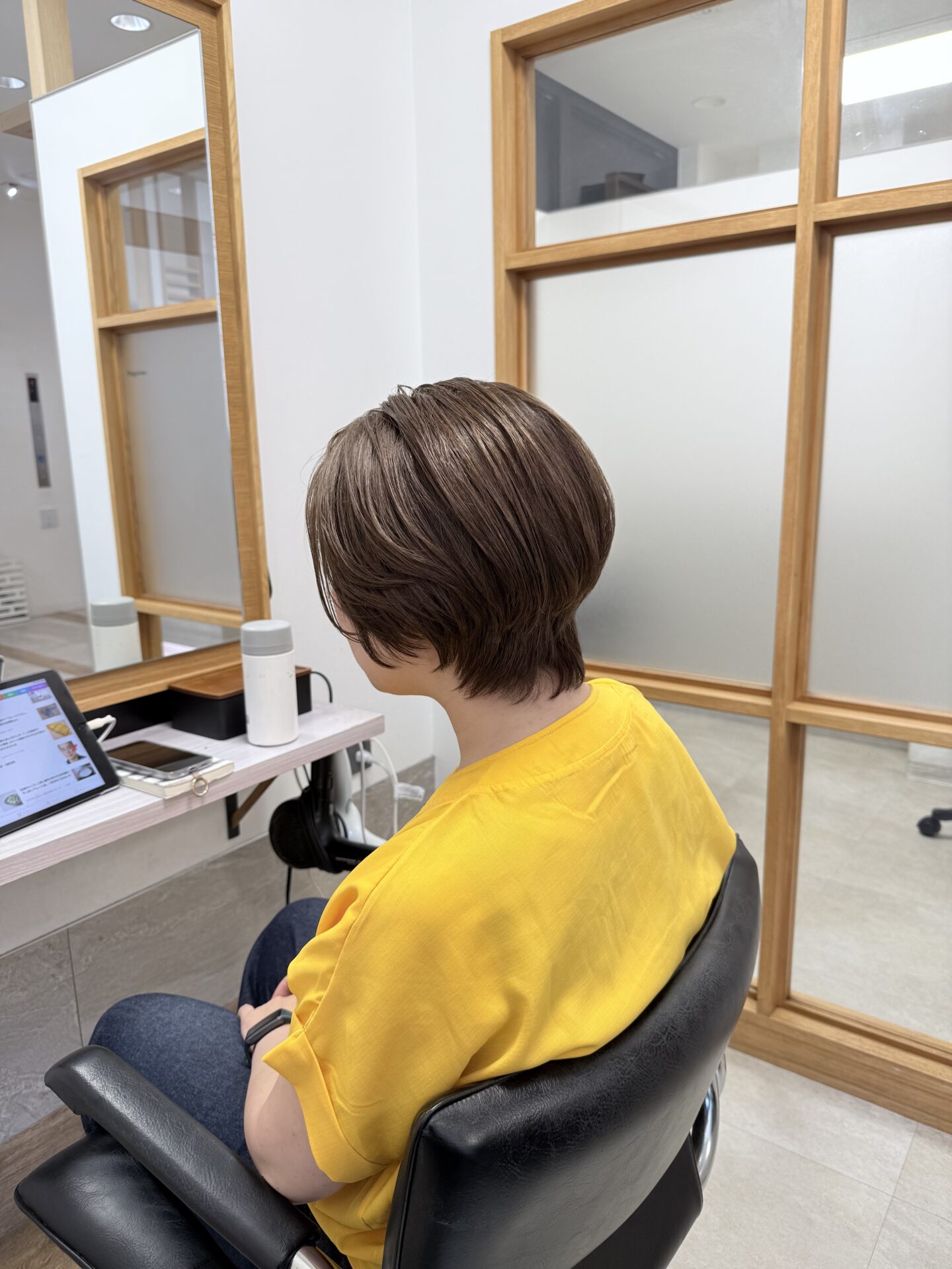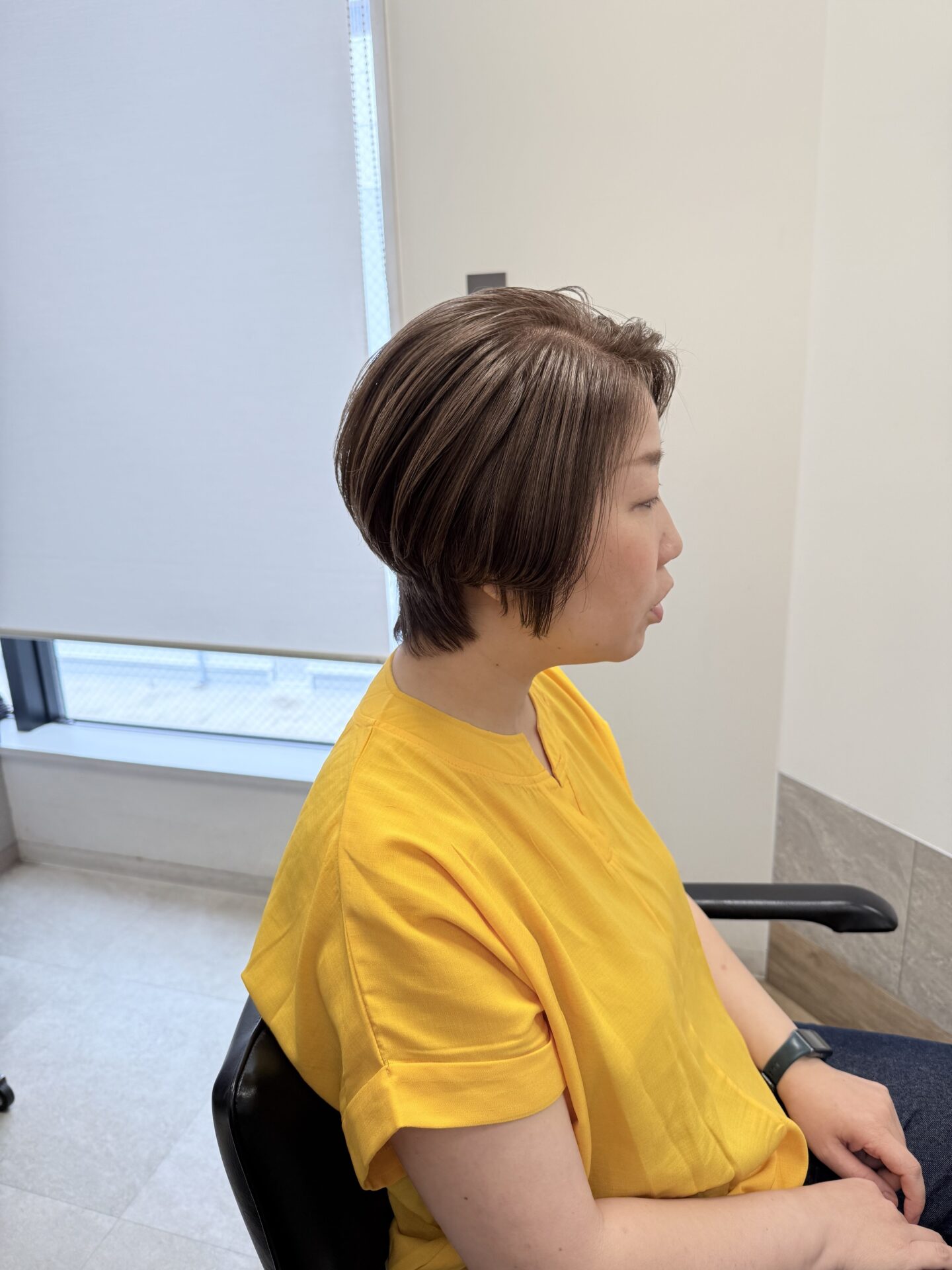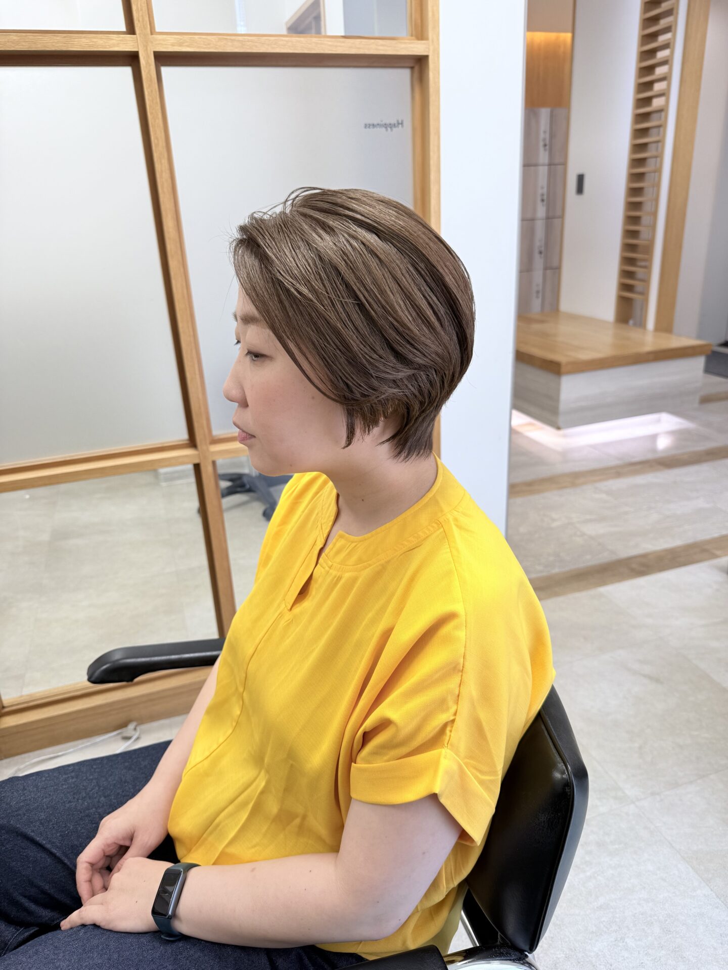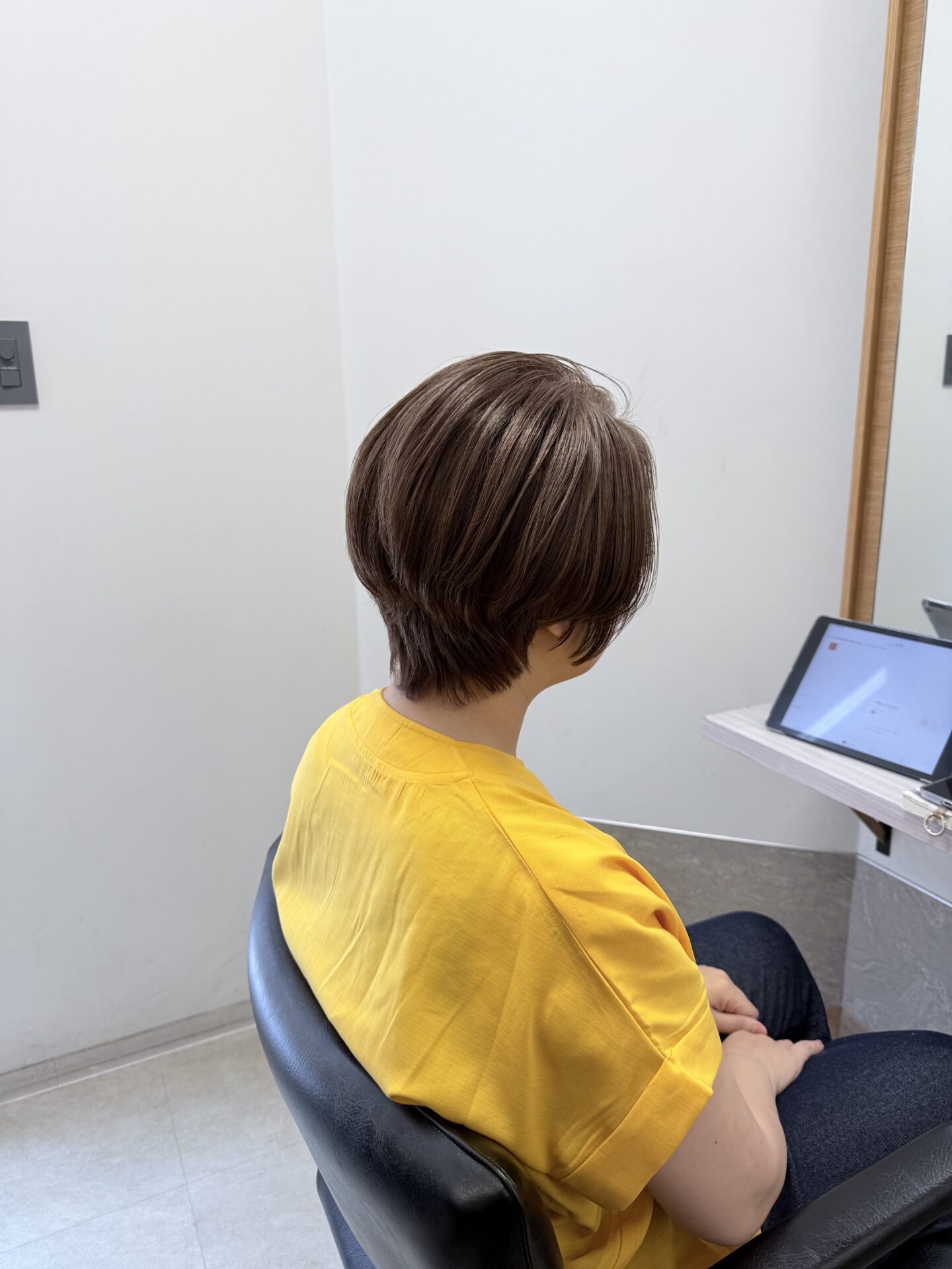 丸みのあるショートスタイル。 白髪率70%のため、濃いすぎないカラーの薬剤設定。明るくなりすぎないように調整しています。